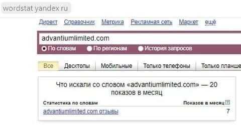 По количеству запросов по названию мошеннического сайта "advantiumlimited com" было сделано 20 поисковых запросов.