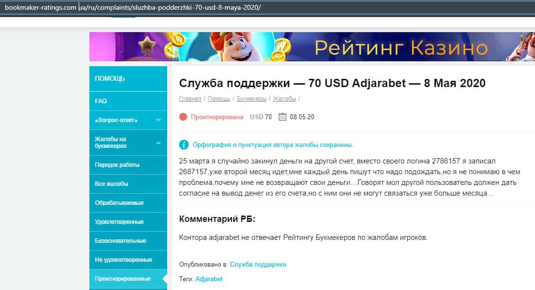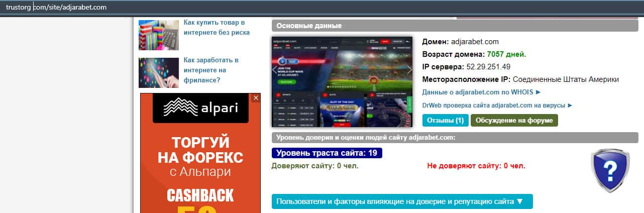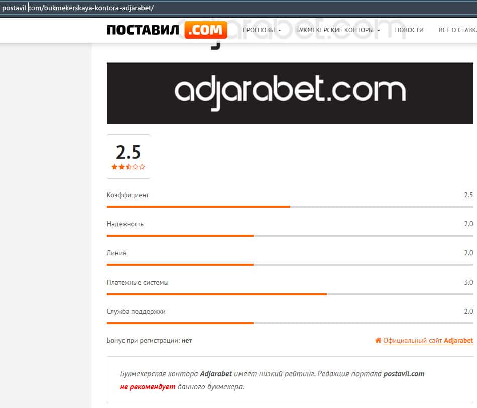 Мошенники AdjaraBet попали в обзор авторитетных ресурсов и там был присвоен им рейтинг ниже среднего, поэтому доверять им свои деньги все же не стоит.