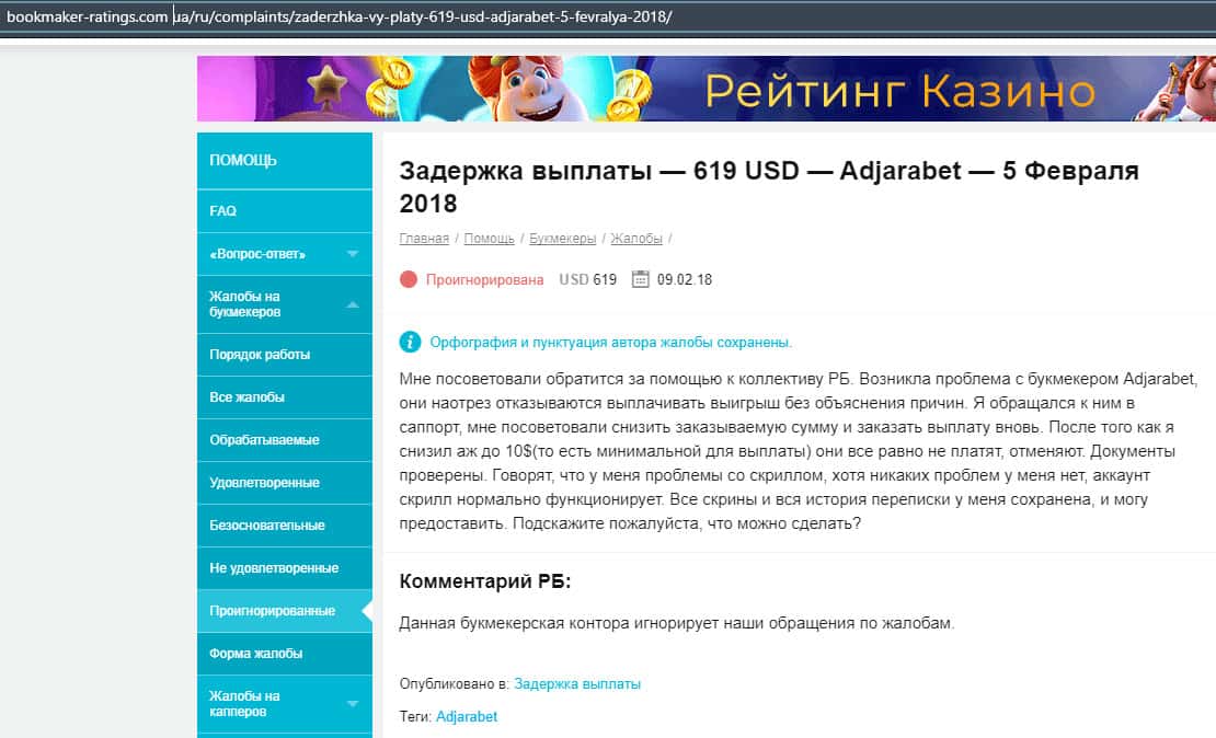 В следующем отзыве описывается жалоба на мошенническую контору AdjaraBet, где указывается о задержке выплаты в 619 долларов и данный вопрос не решается.