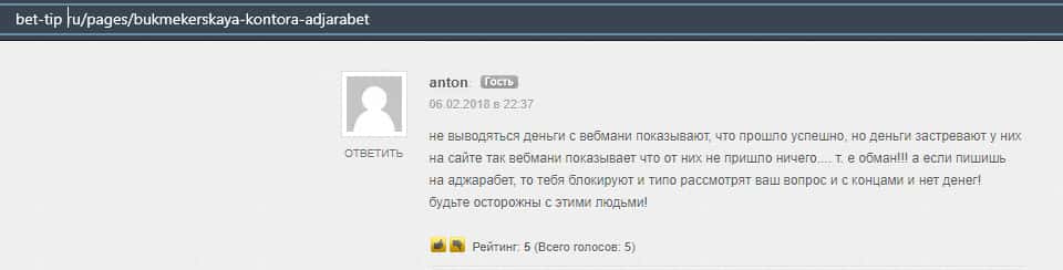 Очередной клиент конторы Аджара Бет указал, что данная букмекерская организация не выводит деньги. При чем причины придумывают всевозможные.