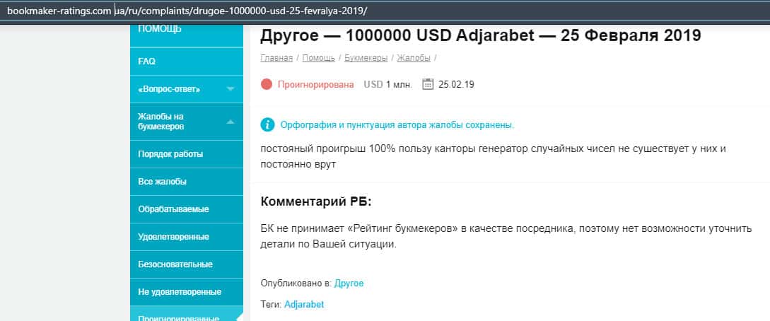 Еще один человек рассказал, что из-за схем конторы AdjaraBet не смог выиграть и вывести деньги, так как они урезают выигрыши, при чем без объяснения каких-либо причин.