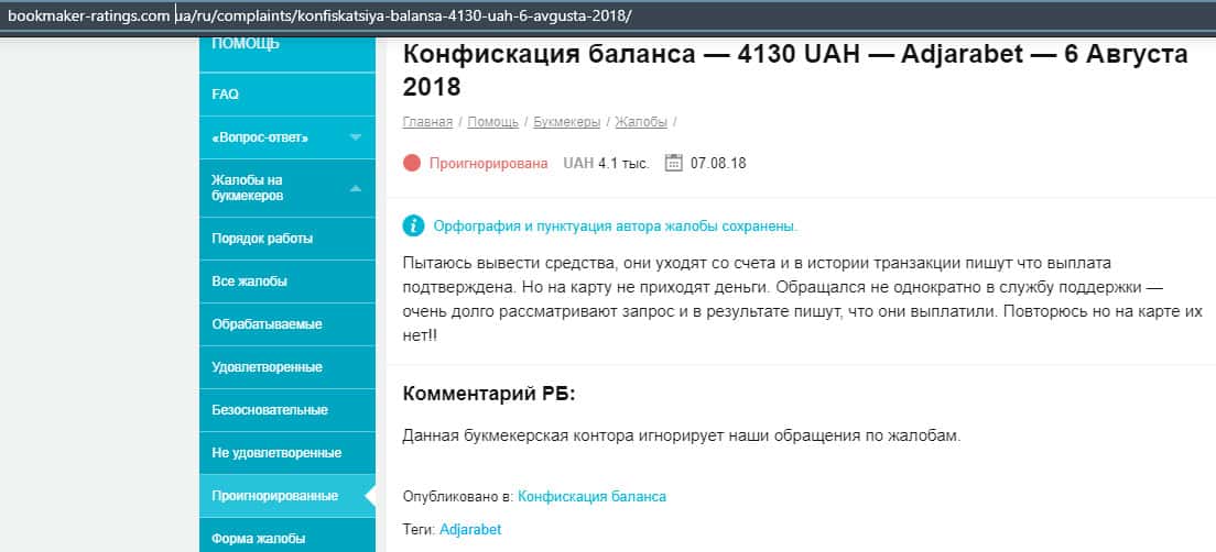 В следующем отзыве описывается, что контора AdjaraBet конфисковала деньги со счета клиента на сумму свыше 4000 гривен, а соответственно вывести их не удается.
