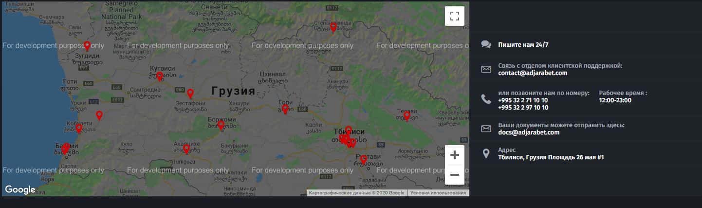 Мошенники AdjaraBet на своем ресурсе разместили телефоны, электронные почты и даже адрес в Грузии, но обычно они не отвечают, когда дело касается вывода денег: