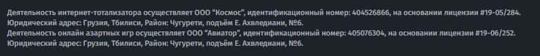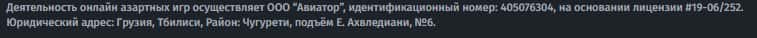 Следующим юридическим лицом конторы AdjaraBet выступает некое ООО "Авиатор", которое зарегистрировано по тому же адресу и имеет регистрационный номер 405076304.