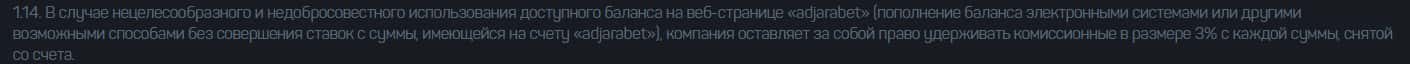 Контора AdjaraBet указала в своем соглашении, что любая техническая неполадка с их стороны будет считаться как внештатной ситуацией и ответственность они нести не будут.