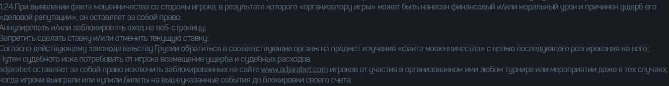 В случае, когда аферисты букмекерской конторы AdjaraBet посчитают, что вы недобросовестно пользуетесь деньгами на своем счете, то они могут заблокировать вас.