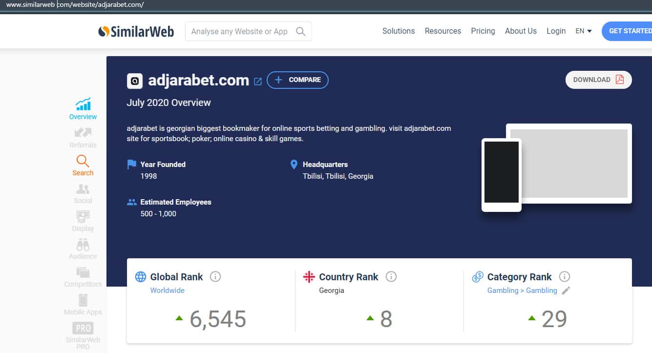 Чтобы узнать источники трафика, мы решили проверить сайт конторы AdjaraBet по ресурсу similarweb com. Как оказалось весь трафик идет из Грузии и занимает в этой стране 8-е место.