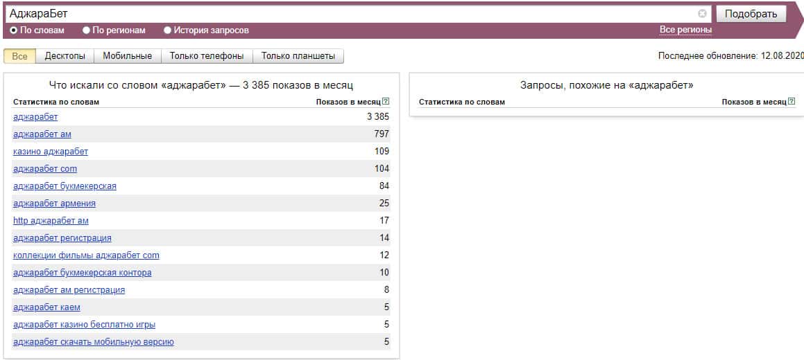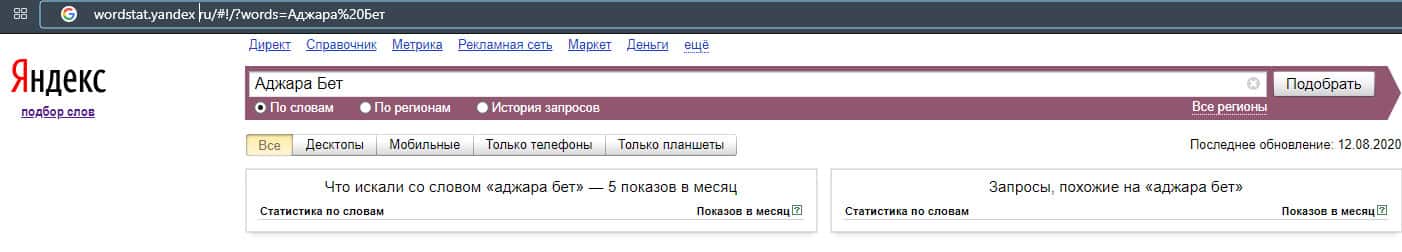 Что касается бренда мошенников "АджараБет" в другом виде, то здесь другая ситуация ситуация согласно системе Яндекс.Вордстат и бренд набрал 3385 показов за месяц.