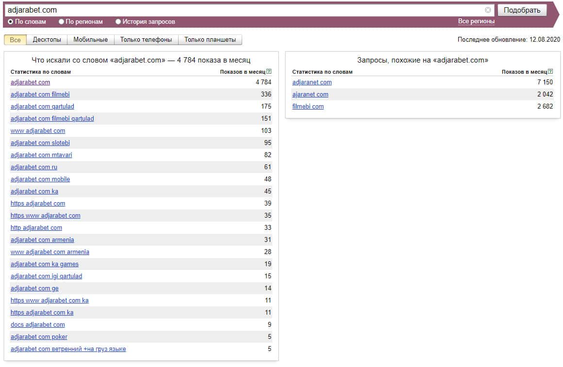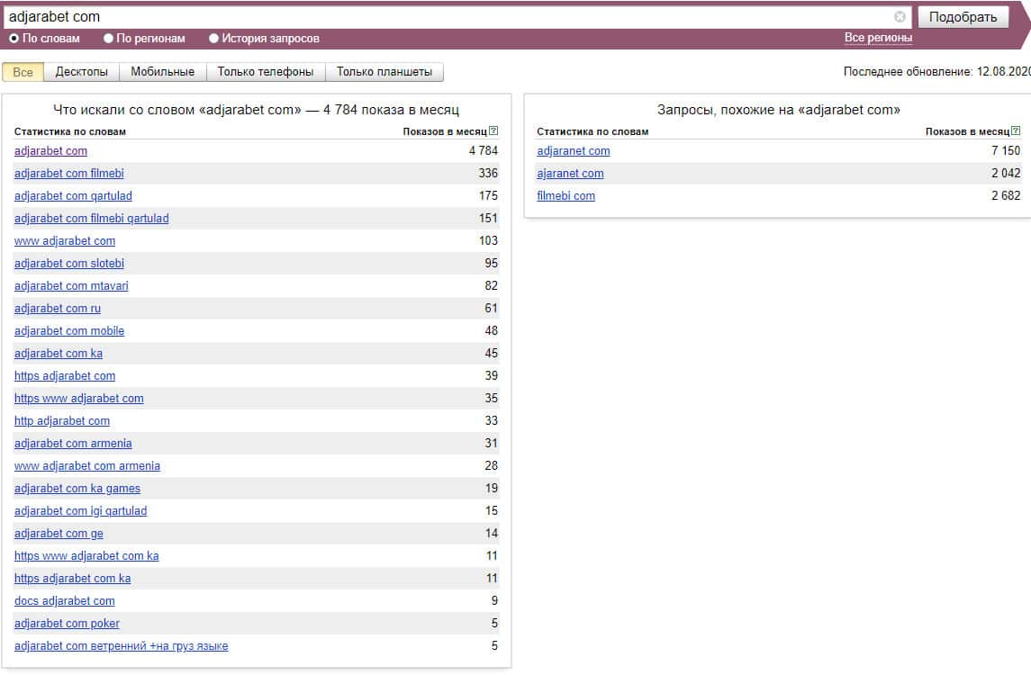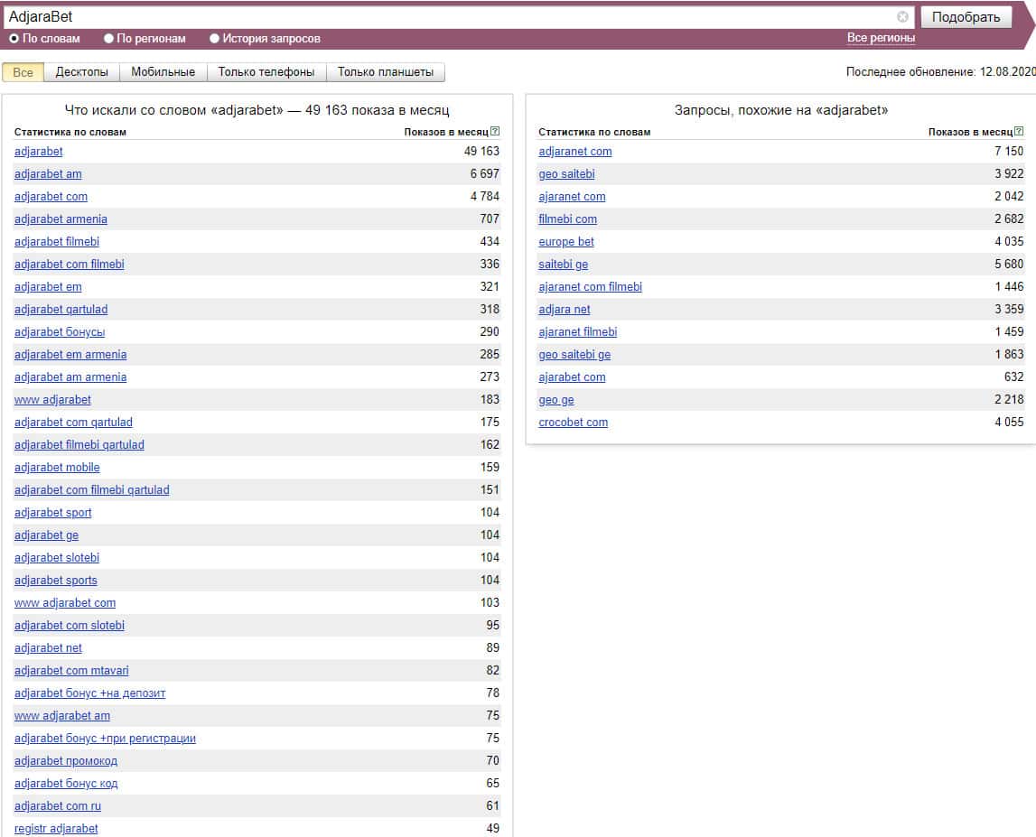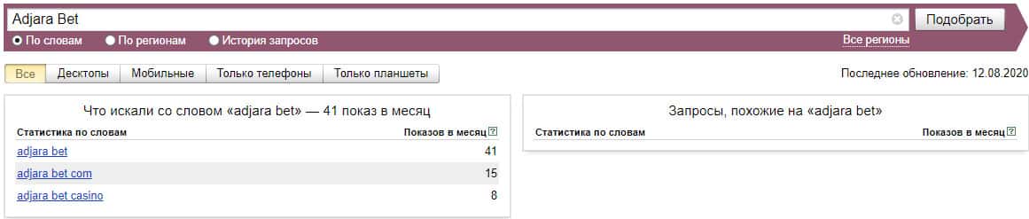 Если рассматривать поиск самого сайта "adjarabet com", только без точки в домене, то система Яндекс насчитала около 4784 показов за месяц.
