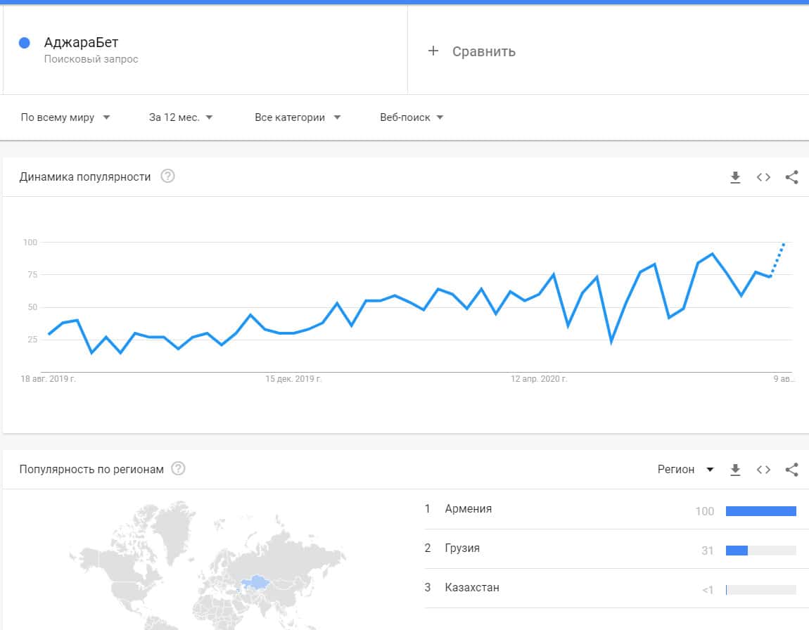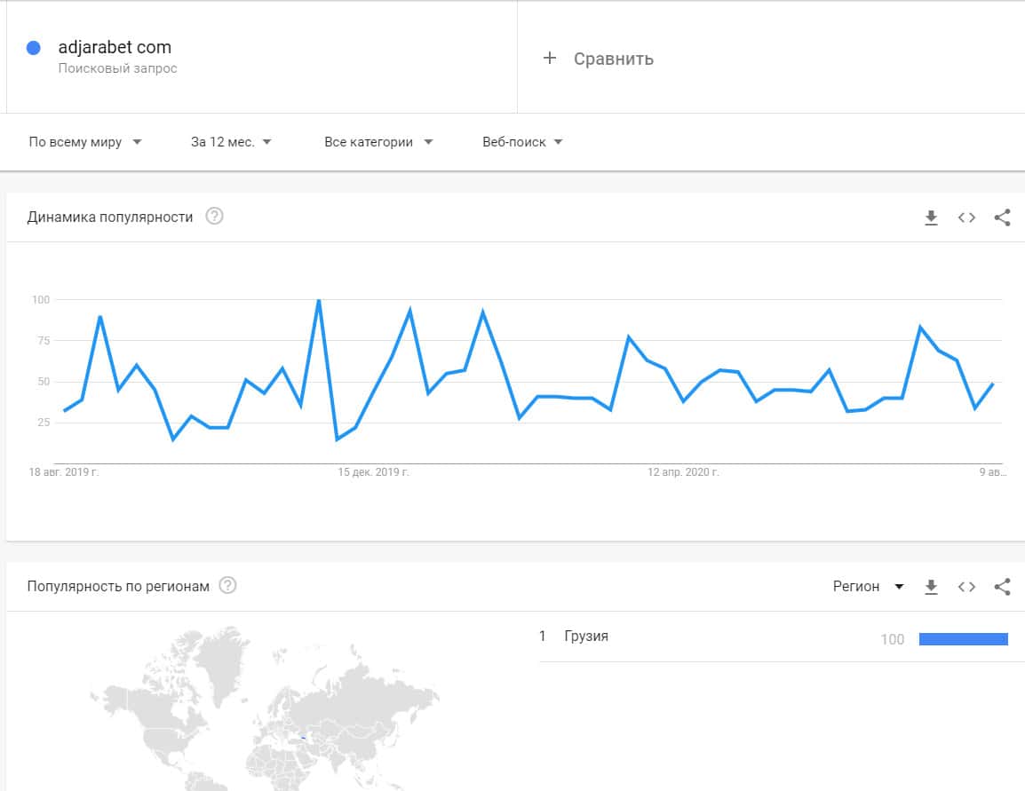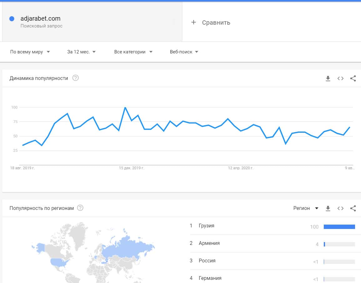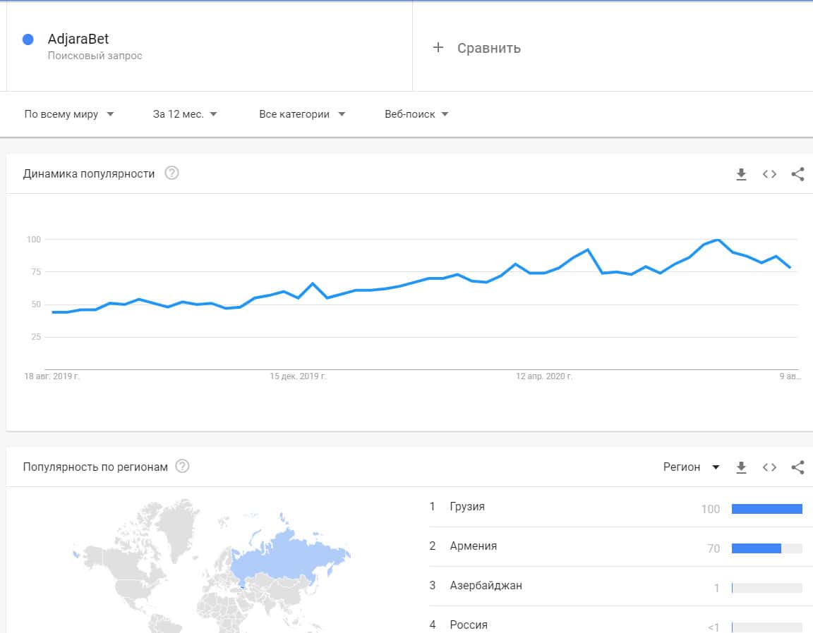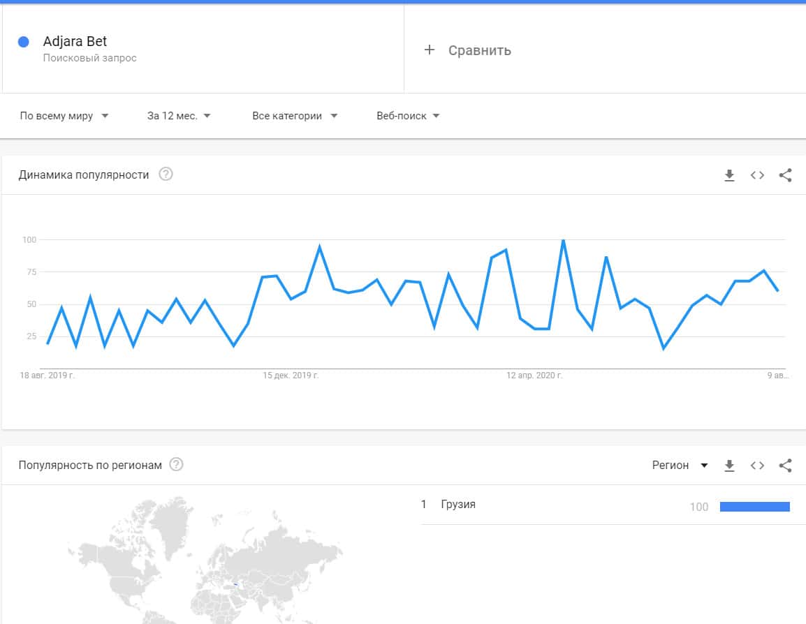 Запросы бренда "Аджара Бет" вообще не популярный в поисковой системе Гугл, так как он не имеет никакой распространенности среди сообщества игроков по ставкам.