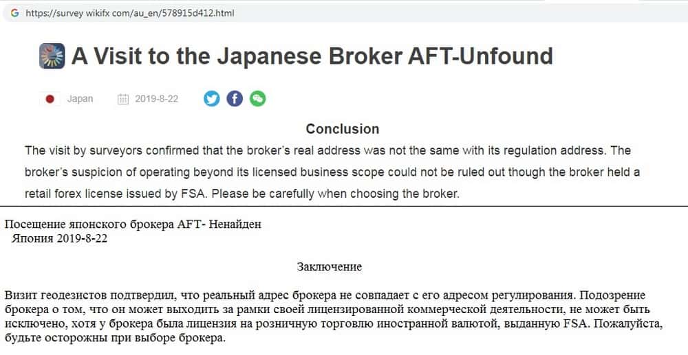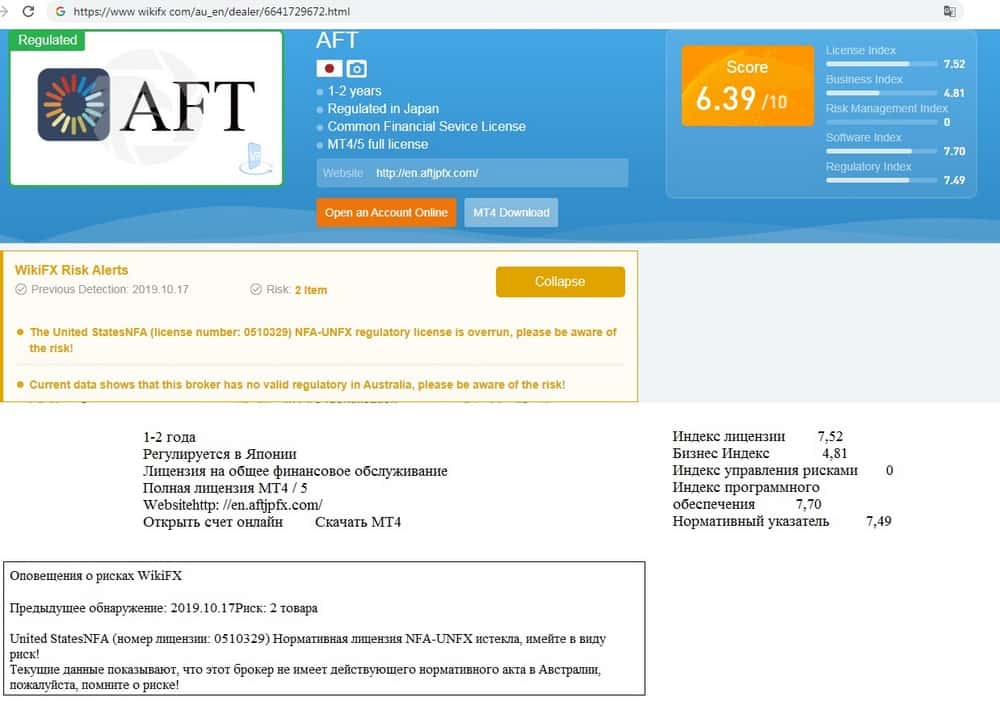Брокерская кухня была исследована экспертами wikifx вдоль и поперек. Одна из главных причин, по которой изначально не стоит доверять АФТ, отсутствие регуляции за пределами Японии и истекший срок лицензии. Шарашка AFT работает без надзора и нагло сливает чужие деньги.
