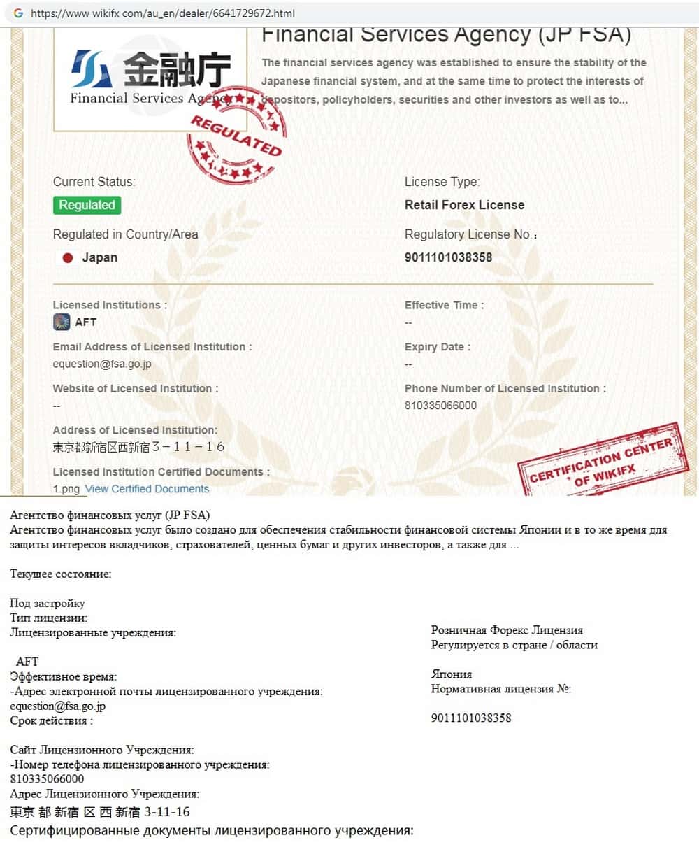 Негодяи из компании АФТ на каждом углу распространяют инфу о наличии лицензии. При тщательном изучении оказалось, что лицензия эта распространяется только на жителей Японии. Граждане иных стран не попадают под действие этого разрешения. Поэтому, если произойдет обман, ответа не понесет никто.