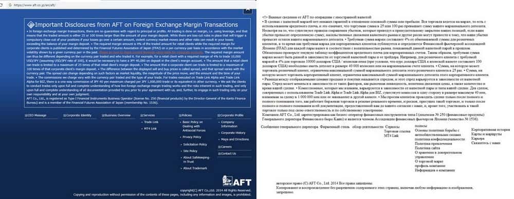 Без отказа от ответственности не обходится ни один мошеннический проект псевдо-брокеров, имеется дисклеймер и у АФТ. Находим его версию на английском, перелистнув главную страницу до конца. Как и водится, жульё ничего не гарантирует, а у клиента вполне возможно возникнут финансовые проблемы.