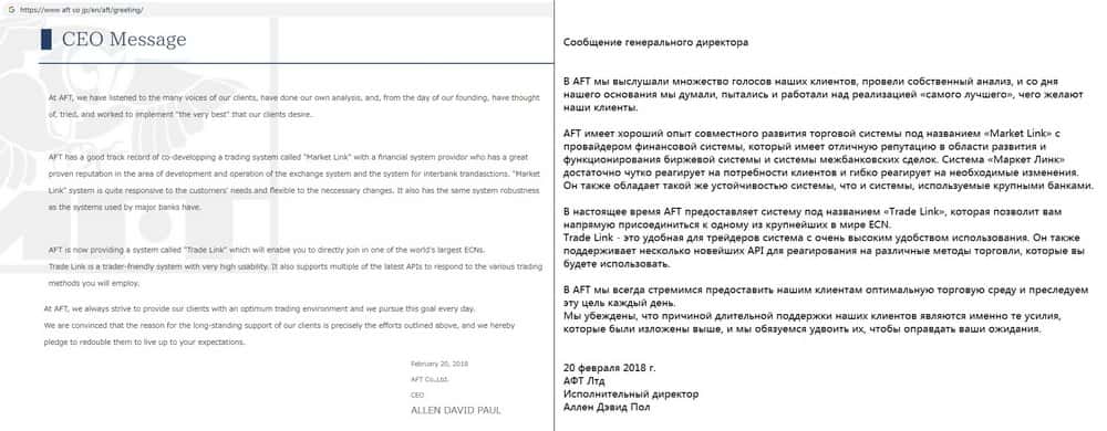 Сайт компании AFT вполне правдоподобен, там и имя директоров имеются. В приветственном слове узнаем, что генеральным директором является Allen David Paul. Также в профиле компании имеется имя представительного директора – Toshie Miyashiro.