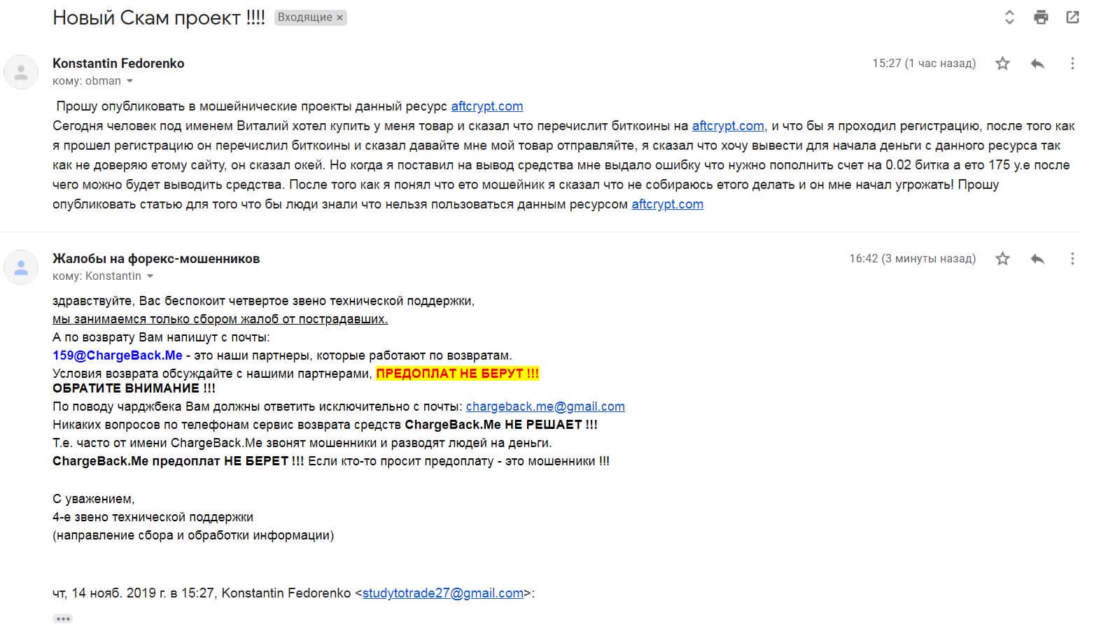 У мошенников AFTCrypt Com только один способ связи - электронная почта. Номера телефона, по которому им можно было бы позвонить, просто нет. Поэтому, если вы им написали, то остается только ждать. Хотя скоро и ждать скорее всего не понадобится, потому что мошенники закроются.