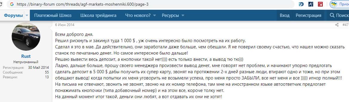 Рассерженный клиент оставил на форуме свой негативный отзыв о том, что он вложил 1000 долларов на счет махинаторской компании АГФ Маркетс, а когда захотел вывести свои средства, то его заявку просто проигнорировали. В итоге, затем сотрудники шараги пытались выманить с трейдера еще 5000 долларов, а он просто отказался. 1000 баксов осталась у ворюг.