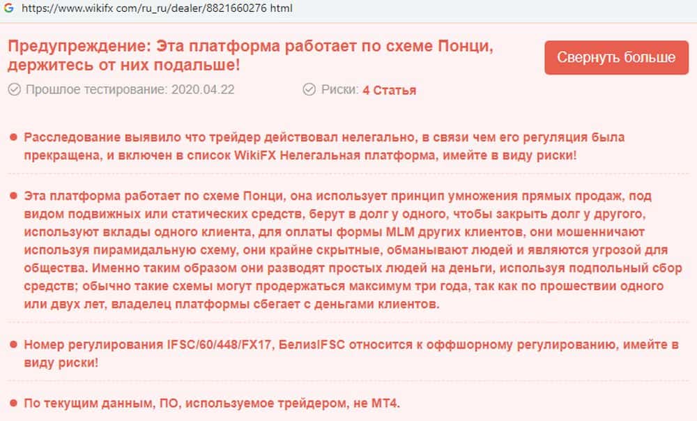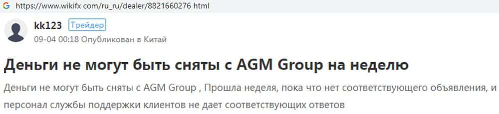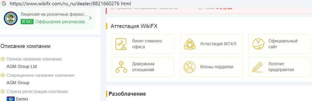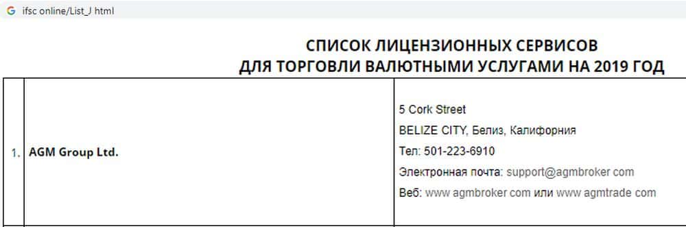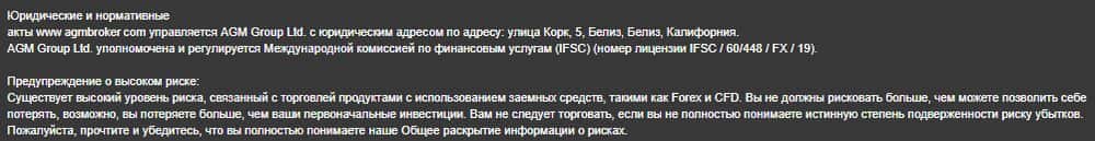 Портал wikifx com предупреждает пользователей держаться от форекс-жуликов АГМ Брокер подальше и не вкладывать в них средства, так как они не имеют нормальной лицензии. Контора зарегистрирована в оффшорном Белизе, а это значит что в случае потери денег, трейдера защитить будет некому, а вернуть их очень сложно.