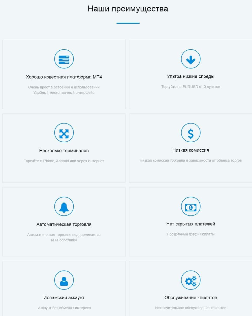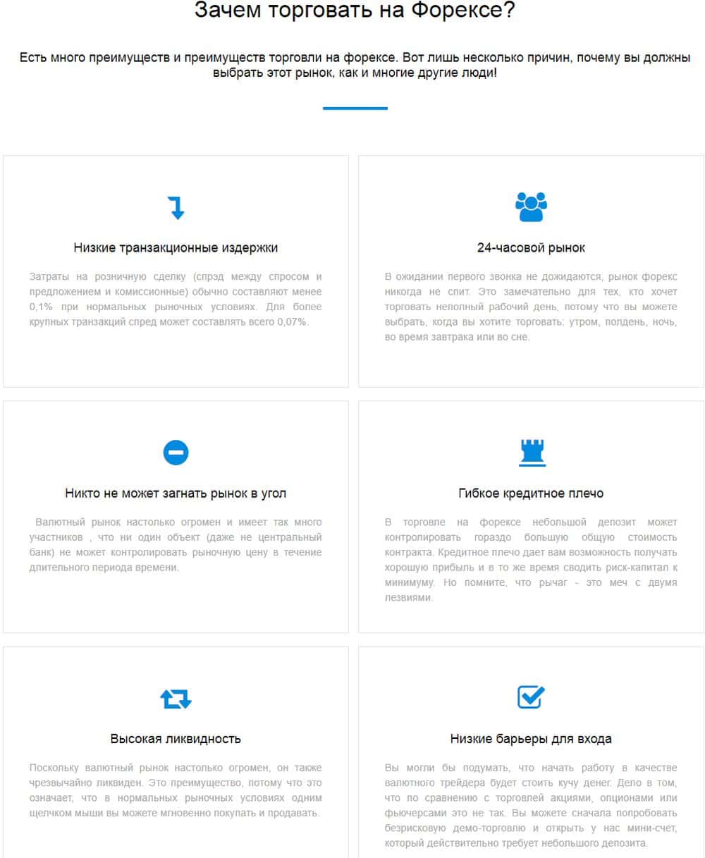 Само собой, фиктивные финансовые воротилы нашли на своем ресурсе место для того, чтобы указать собственные преимущества. Преимуществ вышло целое полотенце (из-за этой растянутости, кстати, с сайтом не очень удобно работать). Вот только вялые они: автоматическая торговля, доступ к платформе, обслуживание клиентов и отсутствие скрытых платежей это не преимущества, это мастхэв.