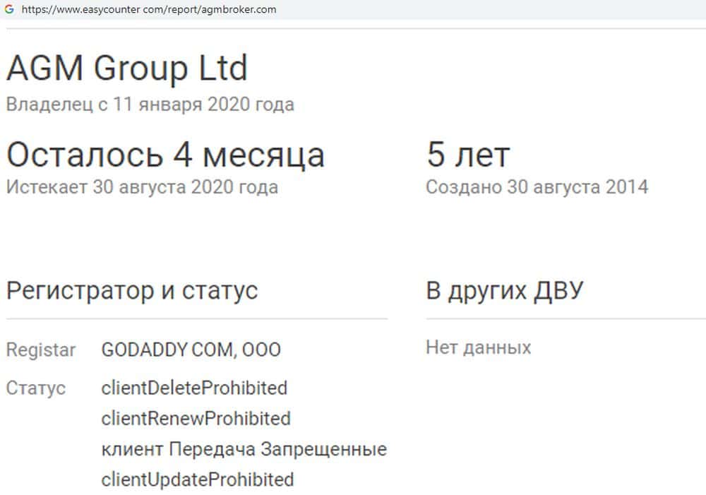 Ответить на вопрос, как давно уже работает на рынке такой "замечательный" брокер, как лохотрон AGMBroker, нам удалось не сразу. Информация на сайте подана так, будто контора работает давно и успешно. Но на самом деле ей всего несколько месяцев, домен был приобретен аферистами AGMBroker в январе 2020 года.