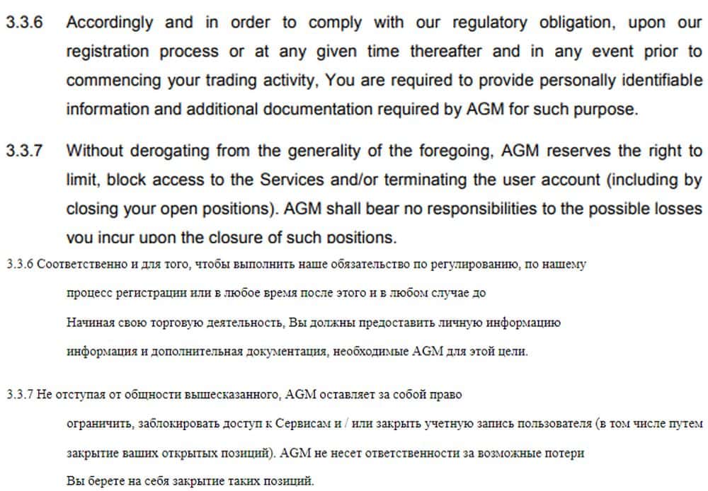 В соглашении черным по белому прописано, что счет клиента в любой момент может быть заблокирован без права на снятие остатка. Просто так, без объяснения причин. Все открытые позиции при этом закрываются, а возможный ущерб (как повезет, можно и в минус уйти) вы берете на себя и жаловаться в этом случае на катал АГМ Брокер бессмысленно.