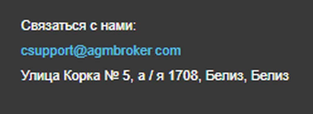 Как и многие подобные скам-конторы, шулера AGMBroker прячут свои темные делишки в оффшорах. Таким образом удобнее скрываться от налогов, регуляторов и жалоб пострадавших. Правда, адрес жулики AGMBroker указали странный - улица Корка № 5, а / я 1708, Белиз. Это адрес самого регулятора, и вряд ли аферисты сидят в соседнем офисе.
