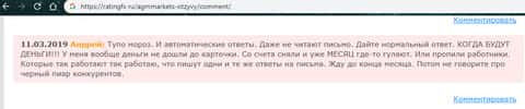 На изображении, расположенном ниже, вы можете увидеть еще один реальный негативный комментарий в сторону аферистов AGM Markets, который связан непосредственно с тем, что мошенники АГМ Маркетс попросту не выводят деньги еще одному клиенту. Вместо этого аферисты AGM Markets хамят пользователю ему или не отвечают на электронные письма.
