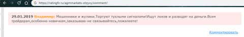 На изображении, расположенном ниже, вы можете увидеть очередной негативный комментарий в сторону шулеров с портала рейтингфкс ру от облапошенного пользователя сети, который связан с тем, что аферисты АГМ Маркетс попросту под предлогом торговых сигналов и подобной инвестиционной информации выманивали у клиента деньги и ею же сливали счет.