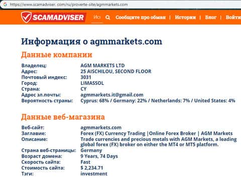 В связи с мошеннической и противозаконной деятельностью лохотрона AGM Markets его руководители предпочитают анонимность дабы избежать ответственности со стороны правоохранительных органов. Информацию о самом сайте шулеров АГМ Маркетс можно узнать с помощью портала scamadviser com, которую вы можете увидеть на изображении ниже.