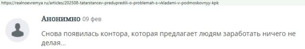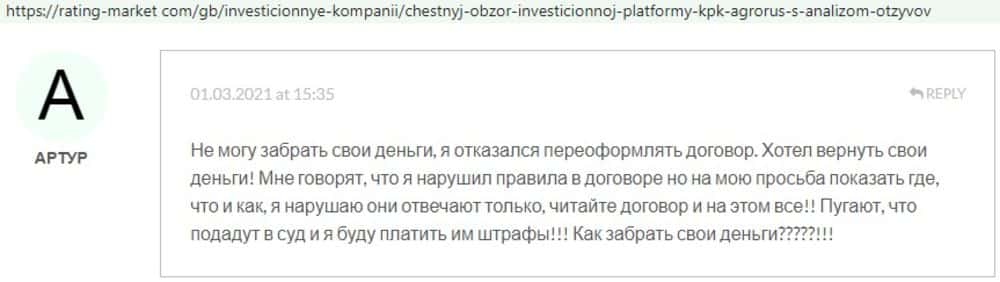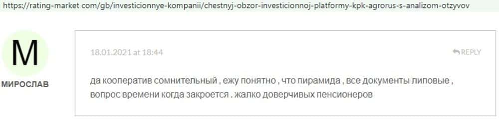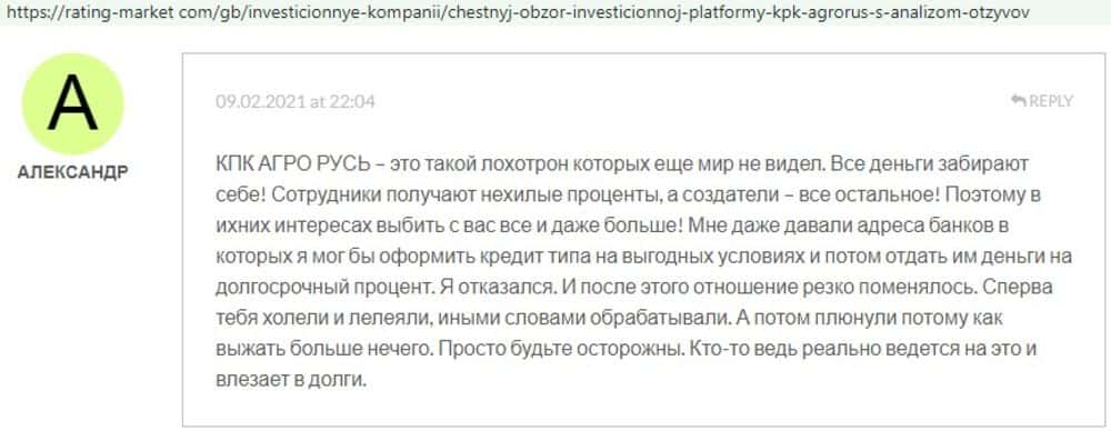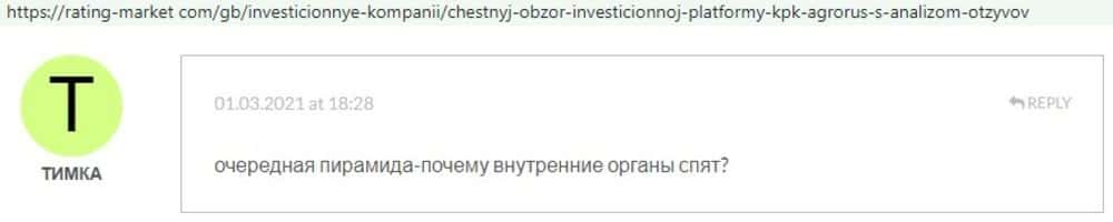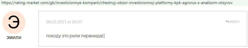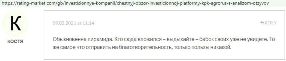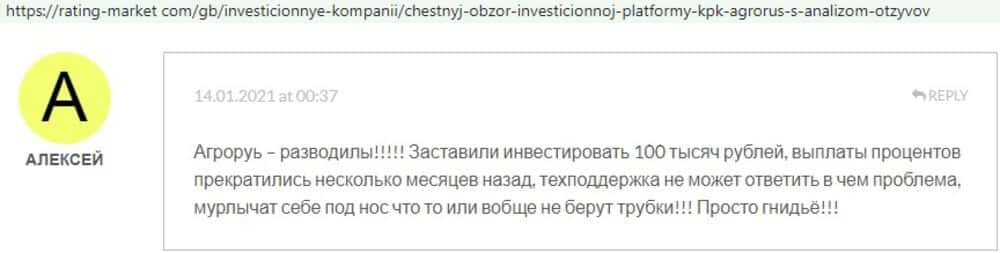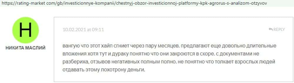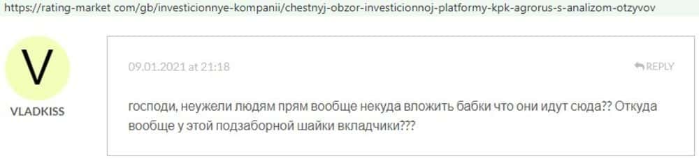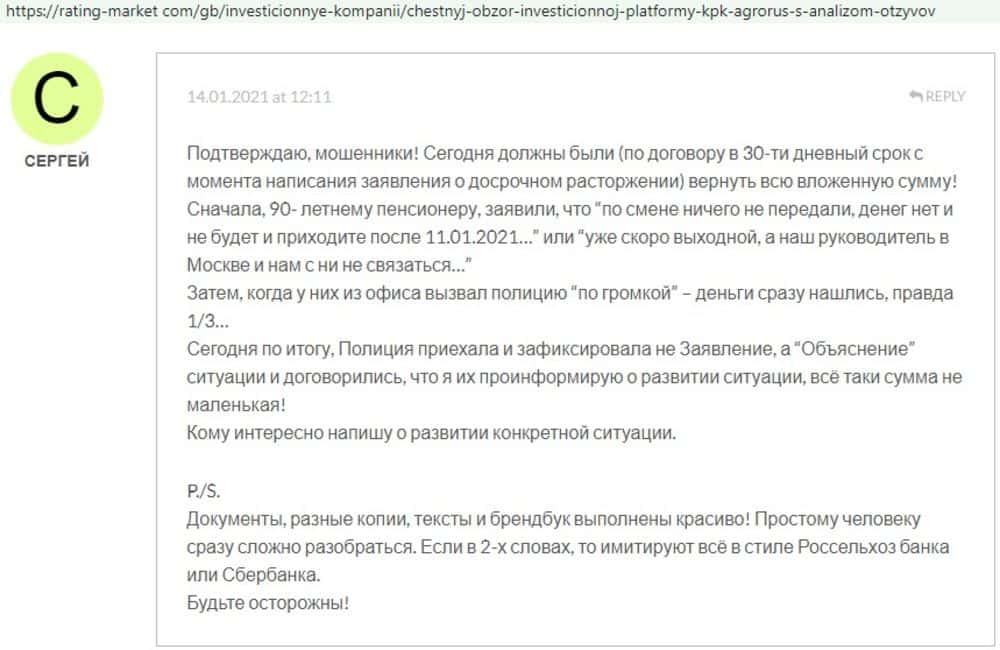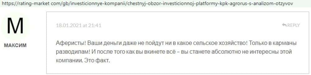 Прочтите, что написал пользователь, который вложил хоть и небольшую сумму в проект KPKAgro Ru. Он до сих пор не может вывести из этой помойки свои денежные средства.