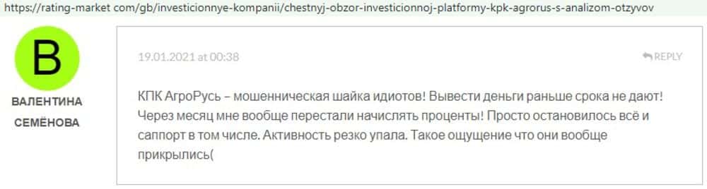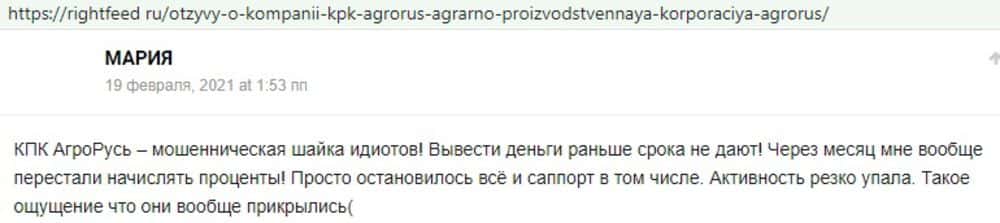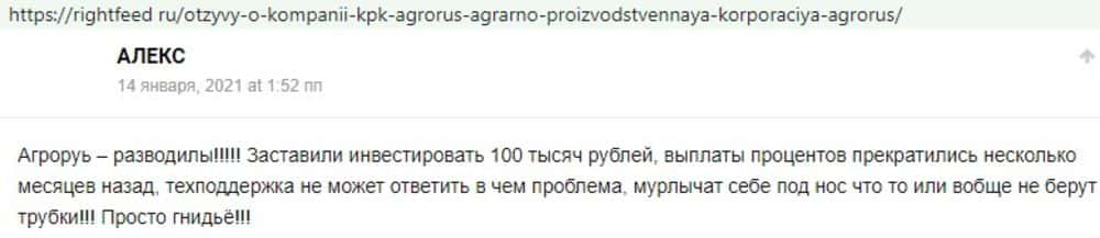 На своей шкуре некоторые пользователи уже поняли, что лоховозка АгроРусь - типичная лохотрония, в который ни в коем случае не стоит вкладывать деньги, а тем более большие.