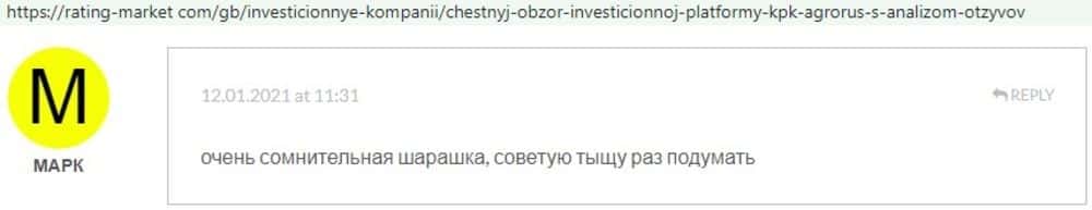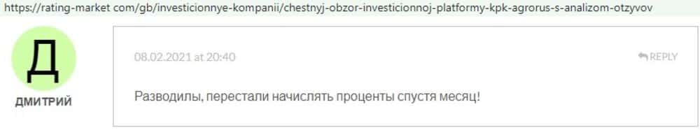 Один из пользователей обманного проекта KPKAgro Ru сообщает, что связываться с веб-негодяями не стоит, поскольку данный проект по его личному мнению проживет не очень долго.