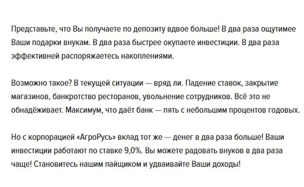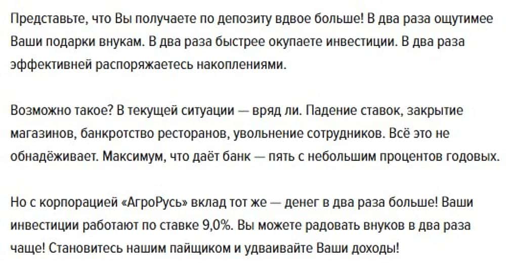 На первый взгляд разводилы АгроРусь выглядят солидной конторой, и многие люди верят им, в надежде получить дополнительный доход вкладывают деньги в пустышку, которая им врет.