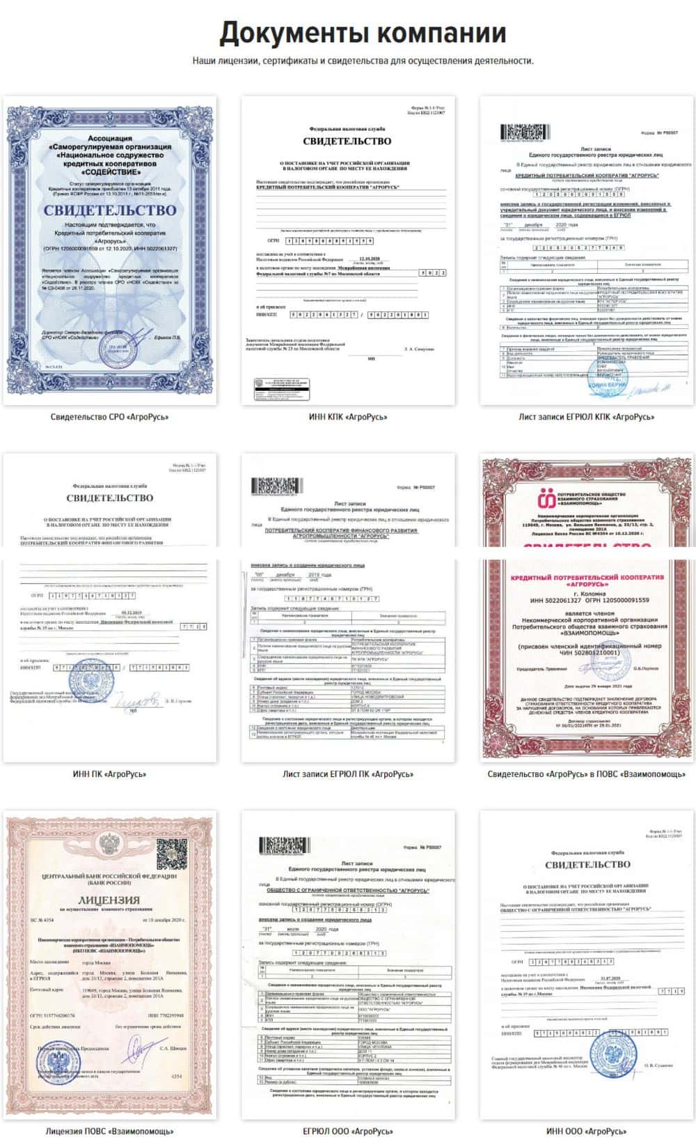 Аферюги АгроРусь опубликовали на своем сайте целый пакет документов о своей, якобы легальной деятельности, но все это фикция. В следующем абзаце, поясню, почему это так.