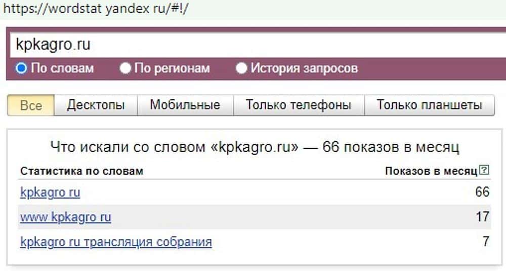 Домен мошенников "kpkagro.ru" крайне популярен среди тех, кто предпочитает поиск Яндекс другим похожим системам. За месяц бренд жулья искали всего лишь 66 раз в сети.