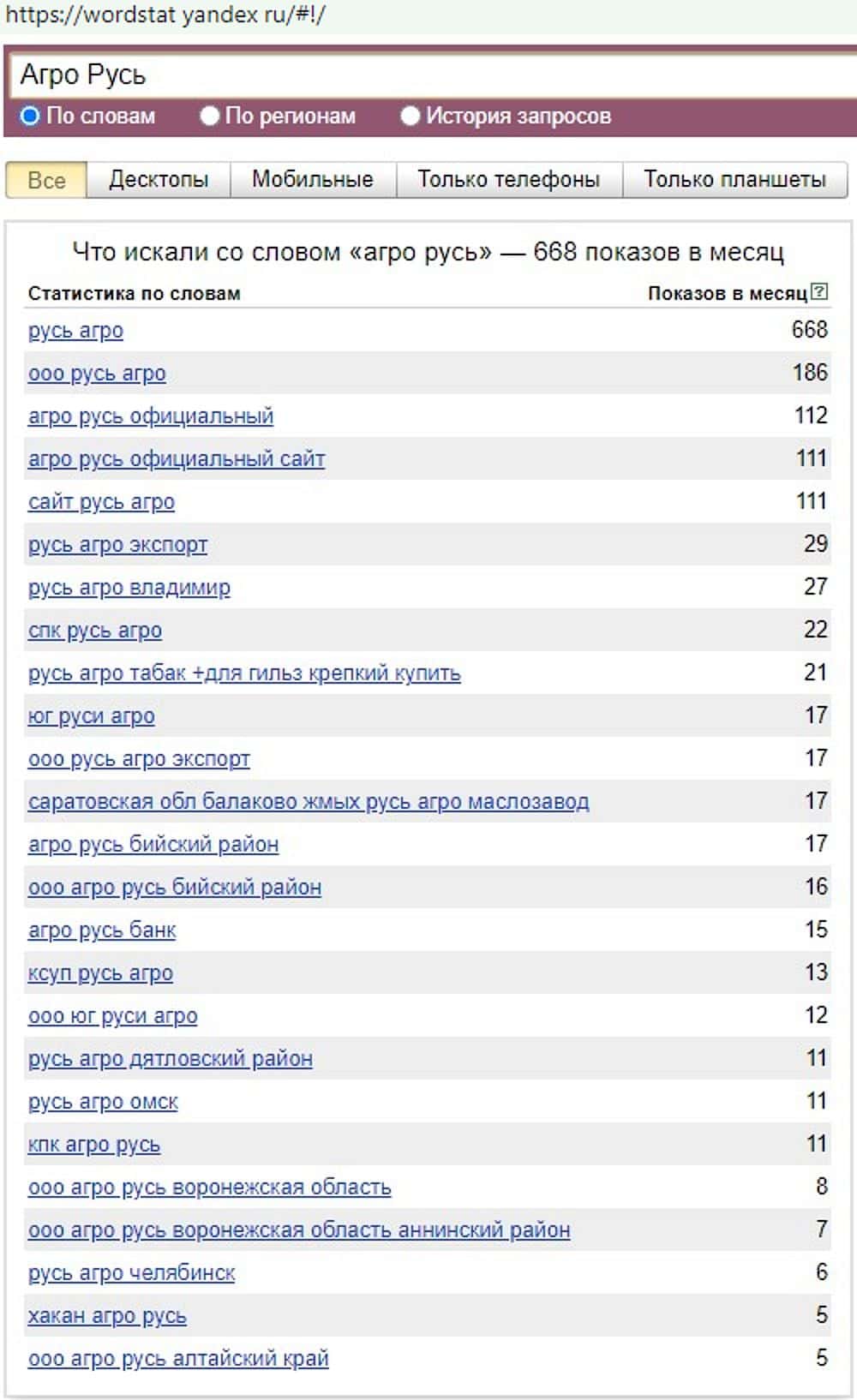 668 показов по запросам "Агро Русь" появлялись на страницах сайта Yandex Ru. Для месячной статистики это конечно не особо много, но все же заставляет насторожиться юзеров.