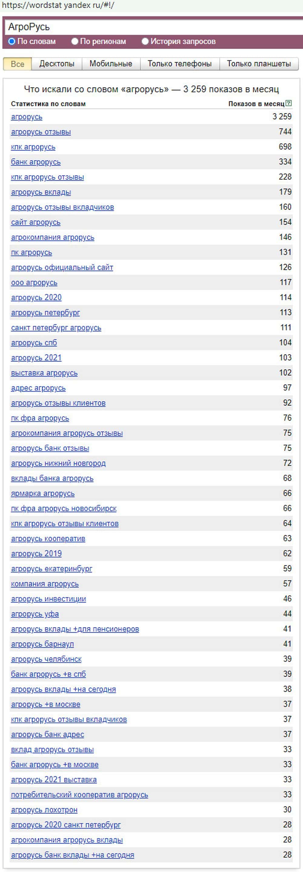 Статистика поиска мошенников по запросу "АгроРусь" дала более продуктивный результат. Их за месяц пытались разыскать 3259 раз, а это уже тревожный звоночек, чтобы бить тревогу.