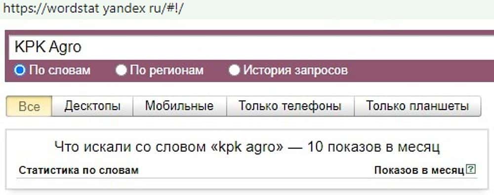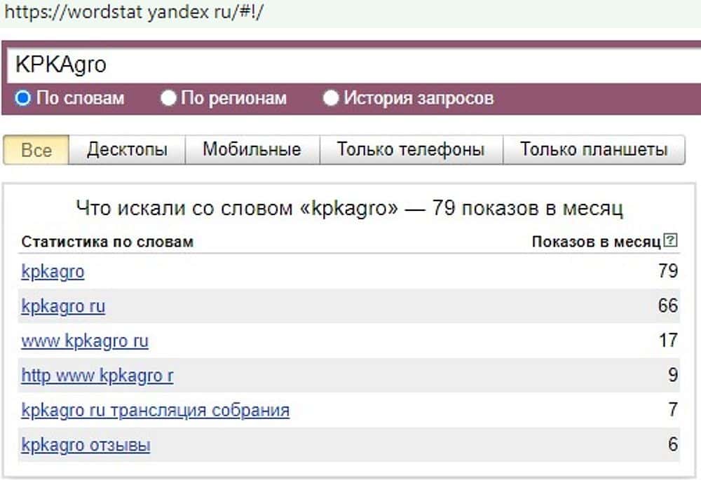 Англоязычный вариант бренда "KPKAgro" не настолько популярен, как его русскоязычная версия, поэтому он набрал всего 79 показов в поисковой нейросети от компании Yandex Ru.