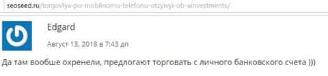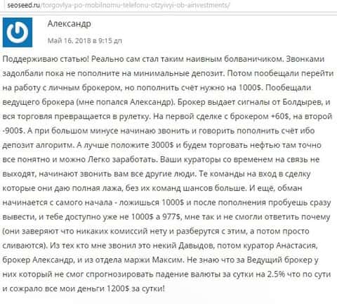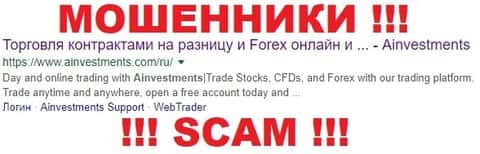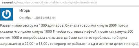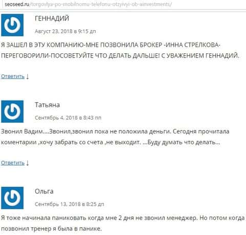 Множество отзывов-жалоб появляется в сети интернет о том, как действуют менеджеры-звонари форекс-конторы Ainvestments. Одному клиенту звонила каждый день звонарька Инна Стрелкова и запудрила так мозги, что человек уже готов нести им деньги. Другому человеку названивал Вадим, который реально уговорил женщину отдать все деньги, а теперь она жалуется, что не может сделать вывод, так как мошенники просят еще вложить деньги. Третий инцидент случился с другой жертвой звонарей кухни Ainvestments. Менеджер сначала заставил вложить деньги, а потом пропал на 2 дня. Женщина упала в панику и позвонил потом трейдер с плохой новостью, что счет весь слит и восстановлению не подлежит. Так что смотрите и слушайте кто вам звонит, если это такие аферисты, то немедленно бросайте трубку!