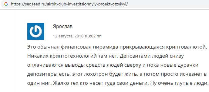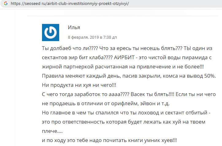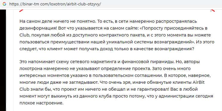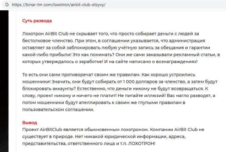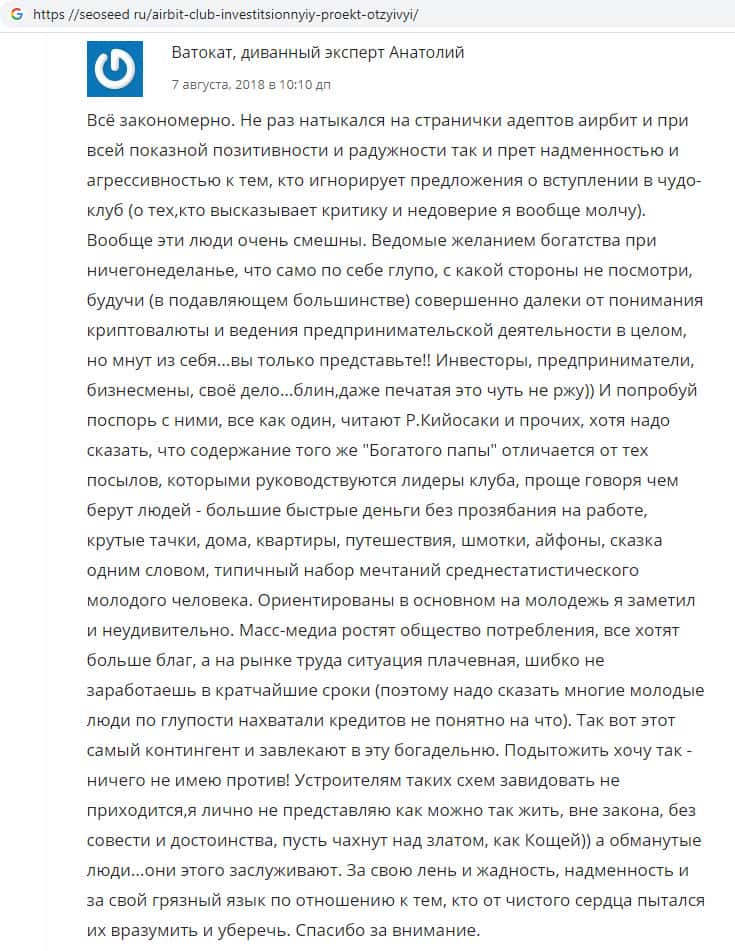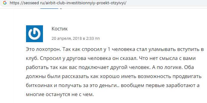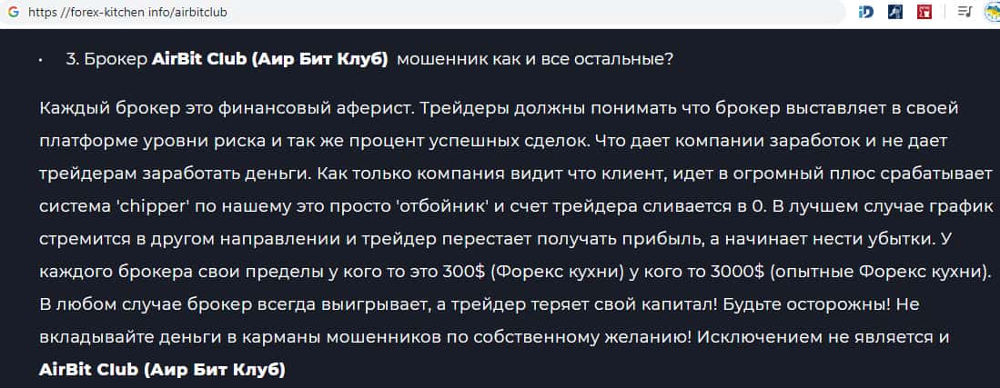 Негативный отзыв от форекс игрока в сторону обманщиков из форекс кухни AirBit Club