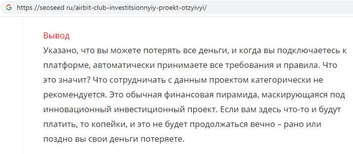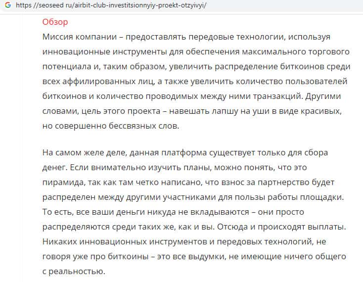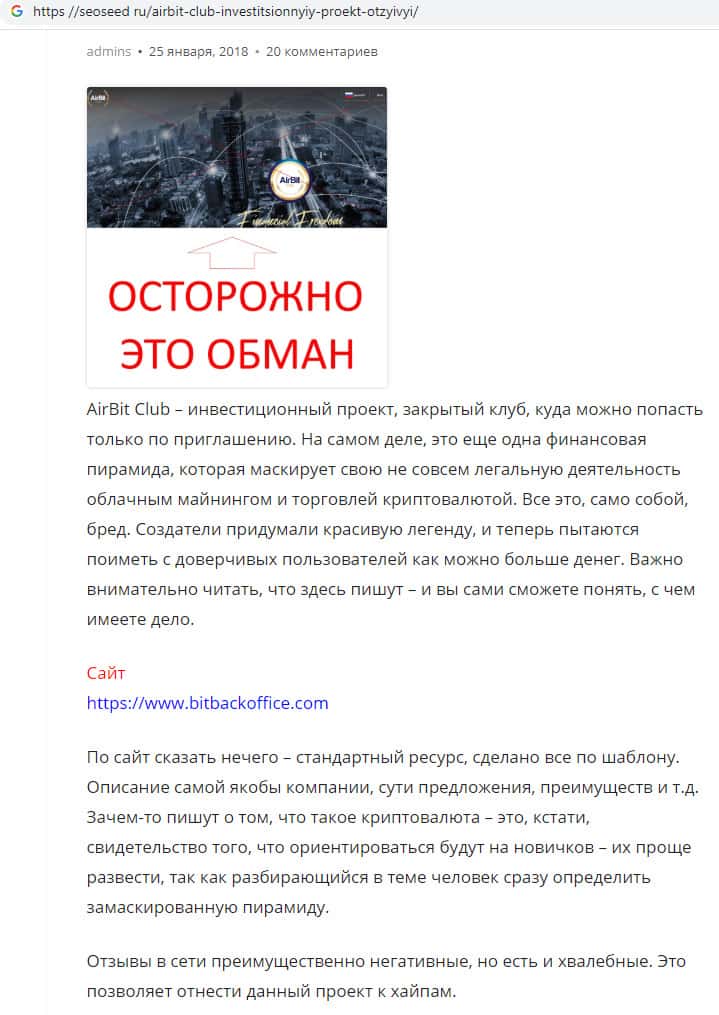 Признанный веб-сайт seoseed ru не рекомендует связываться с липовой компанией AirBit Club