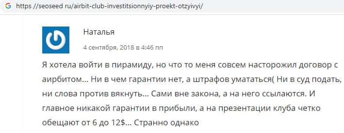 - Комментарий от клиентки о функционировании финансовой пирамиды Аир Бит Клуб