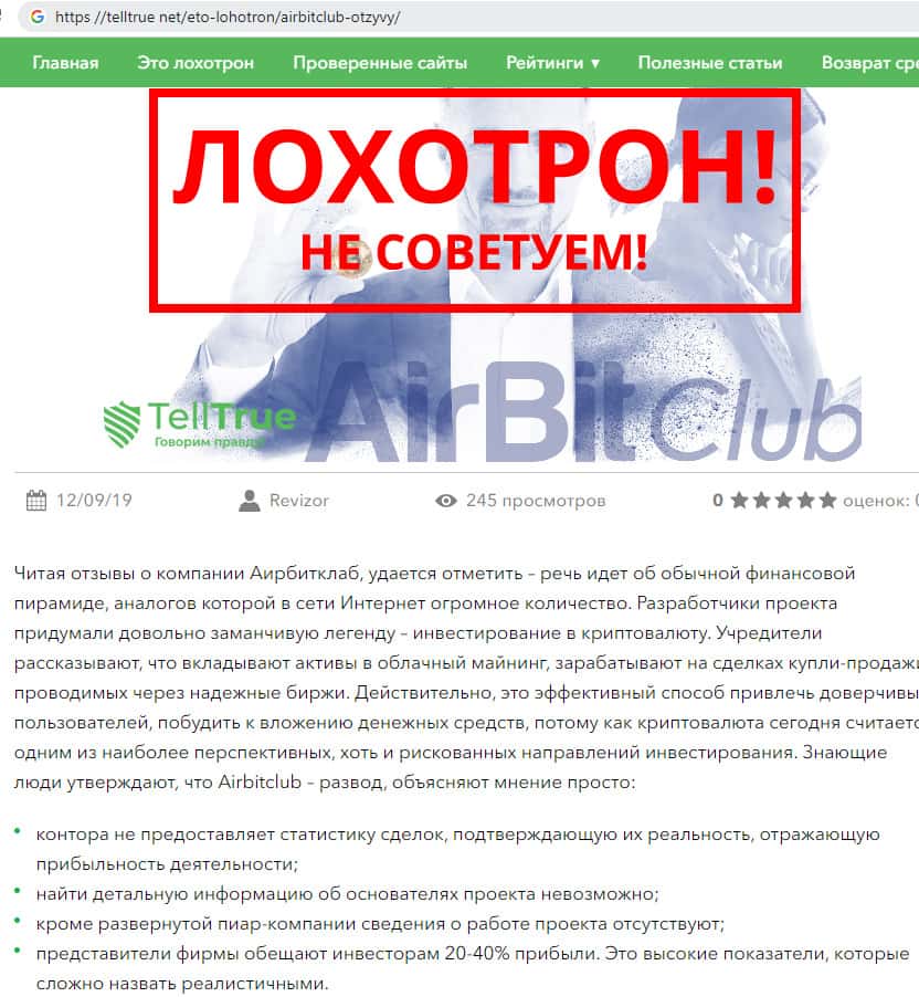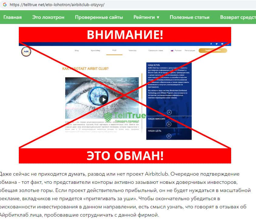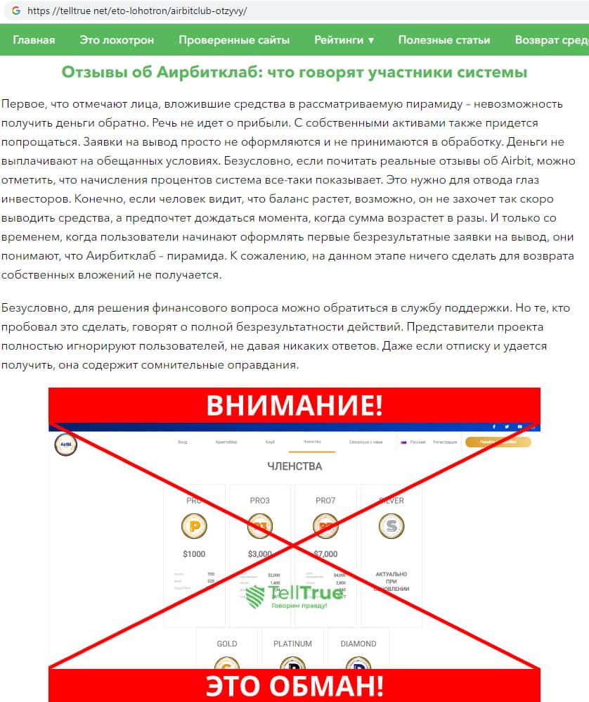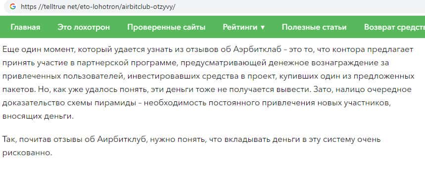 Влиятельный интернет-сайт telltrue net не лучшего мнения о деятельности шарашкиной конторы Аир Бит Клуб