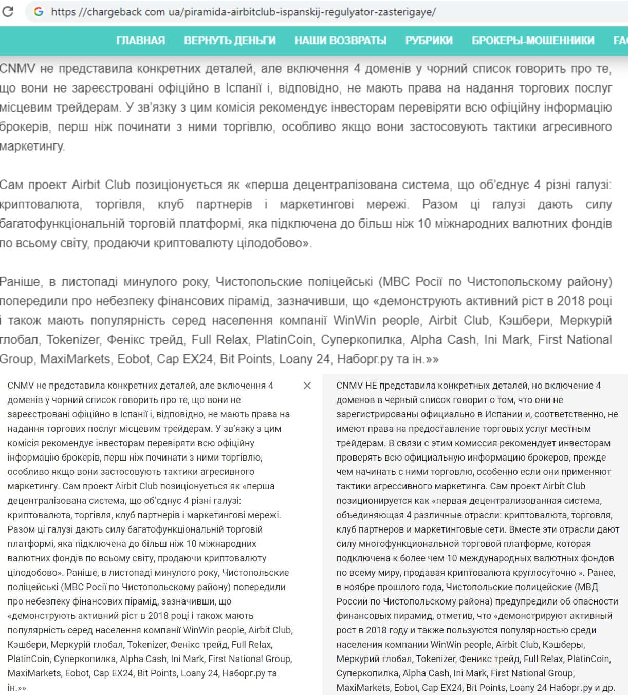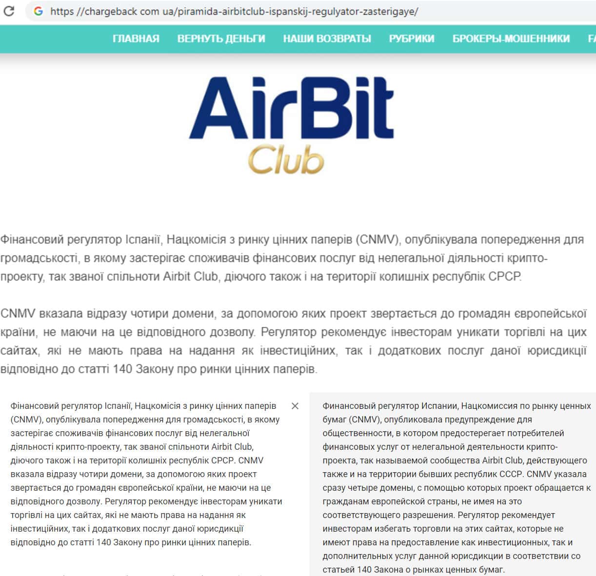 Компетентный веб-сайт в Украине chargeback com ua сообщил весьма важный сведения о том, что Национальная комиссия по рынку ценных бумаг опубликовала предупреждение, что лжеброкер AirBit Club работает одновременно с четырех доменов, что является явным признаком аферистов и мошенничества.