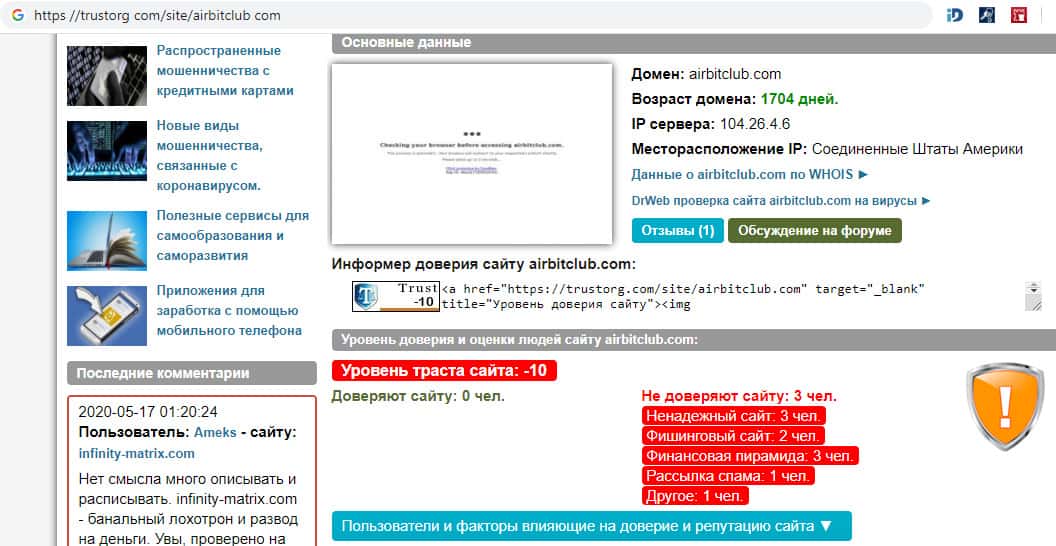 Также нам стало интересно касательно данных о домене мошеннического форекс дилера AirBit Club. Оказывается контора купила себе домен, которому уже больше 3-х лет, чтобы казаться более зрелой. Также есть моменты, что уровень траста в минусовом значении, а не доверяют ресурсу, как минимум 3 человека, фишинговым назвали 2 человека.
