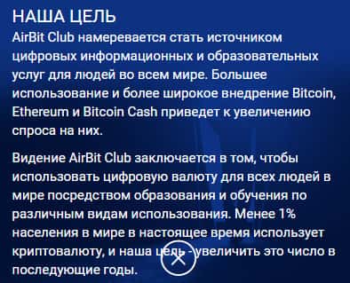 Далее на официальном веб-портале дилинговой конторы AirBit Club находим сведения о том, что основной целью их деятельности является намерение стать источником цифровых информационных и образовательных технологий для людей во всем мире. А между строк, жаль, что нельзя донести истину - нажива на потенциальных вкладчиках и трейдерах.