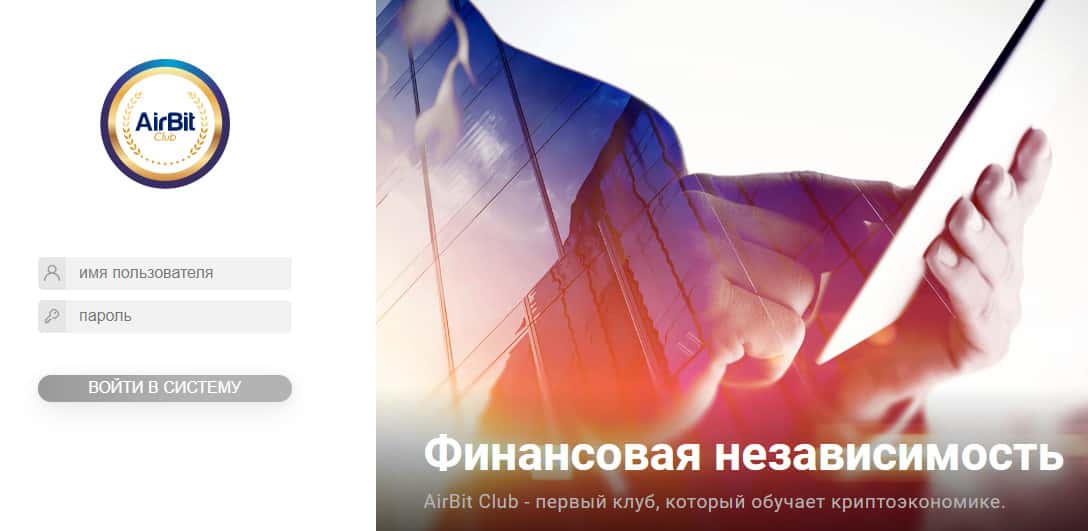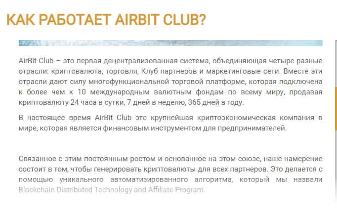 Начинается жульнический веб-сервис форекс кухни Аир Бит Клуб, как обычно с самопрезентации и описания своего превосходства на рынке Форекс. Они позиционируют себя, как крупнейшая криптоэкономическая компания в мире, которая является финансовым инструментом для предпринимателей. Увы, ограбленные форекс трейдеры говорят об обратном.