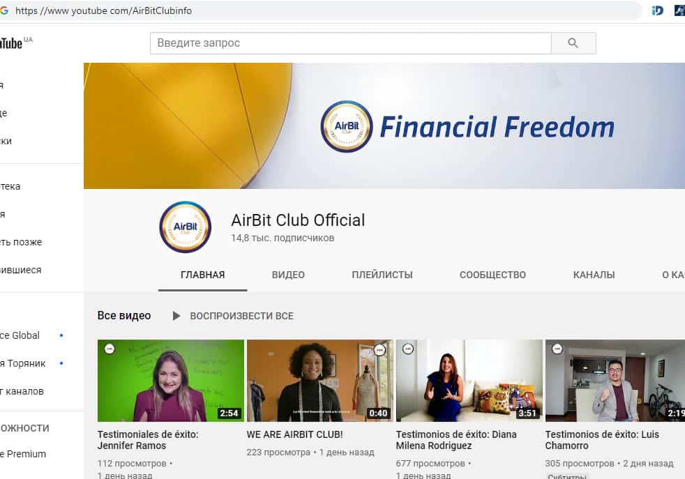 Далее мы расскажем о деятельности фиктивной брокерской организации AirBit Club на Ютубе. Нельзя сбрасывать со счетов охват аудитории данной псевдоброкерской компанией в данной социальной сети, поскольку количество подписчиков достигает 14,8 тысяч. В общем., шарлатаны по-крепкому взялись за развитие своего контента. Адрес youtube com/AirBitClubinfo