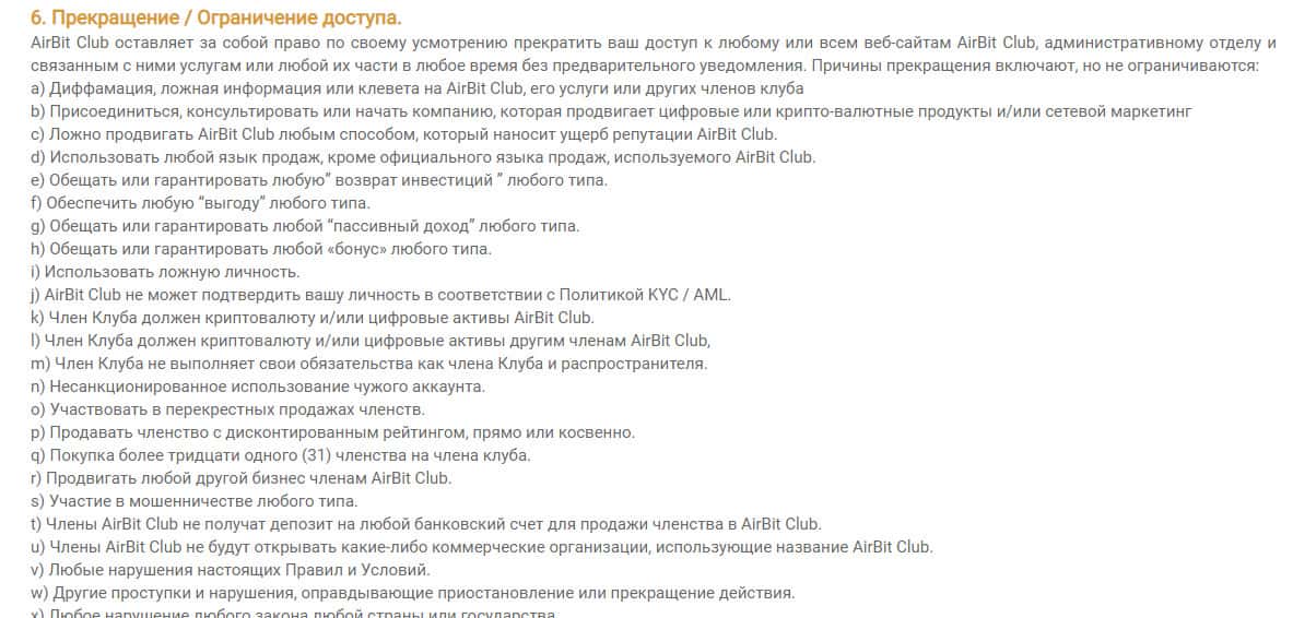 Далее переходим к 6-му разделу клиентского соглашения "Прекращение / Ограничение доступа", в котором черным по-белому пишется, что дилинговый центр AirBit Club оставляет за собой право по своему усмотрению прекратить доступ любого вкладчика к своему порталу. Как минимум, это непрофессионально, как максимум - противозаконно.