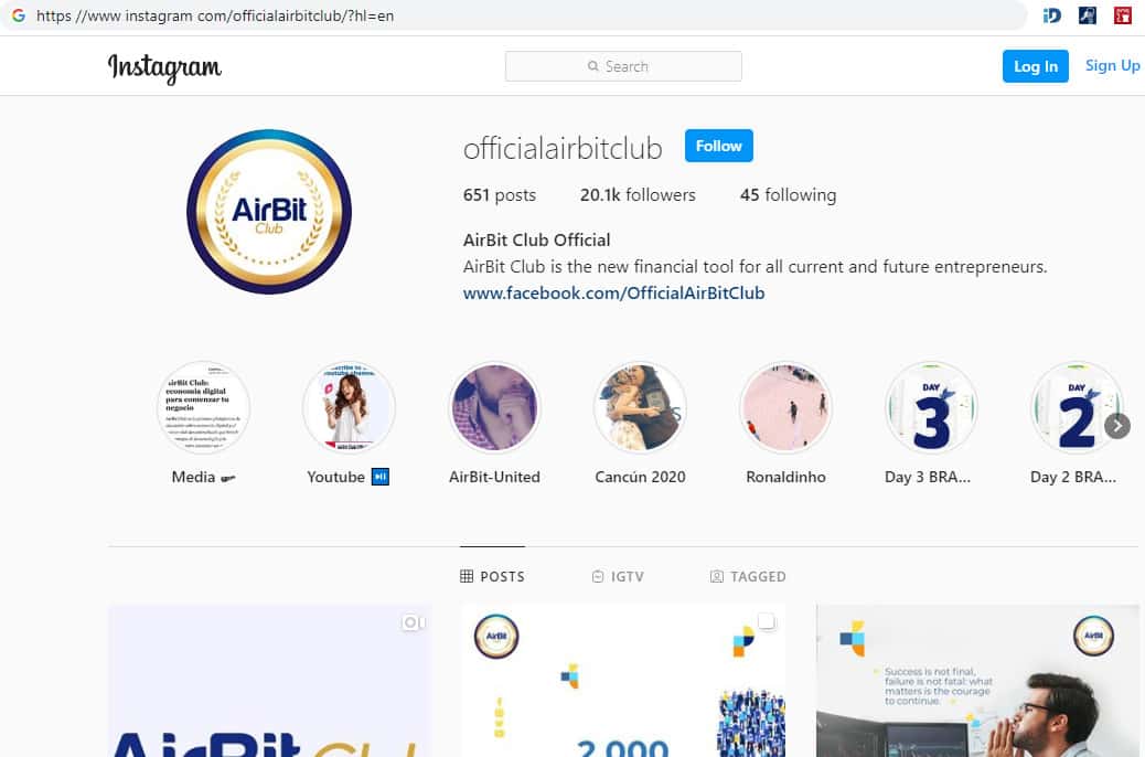 Завершаем исследование мошеннической деятельности воровского форекс дилера AirBit Club в социальных сетях последним - Инстаграмом, где количество их фолловеров достигло 20,1 тысяч человек. В общем, нужно аккуратнее относиться к этому , так как многие потенциальные новички ведутся на привлекательные заманухи таких шулеров.
