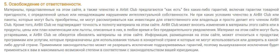 Пятый раздел соглашения "Освобождение от ответственности" посвящен тому, что, например, сам же махинаторский форекс брокер Аир Бит Клуб не подтверждает точность и полноту материалов, которые он сам же размещает на своем официальном интернет-портала. Тогда как можно доверять таким жуликам и вкладывать в них свои же денежные средства.